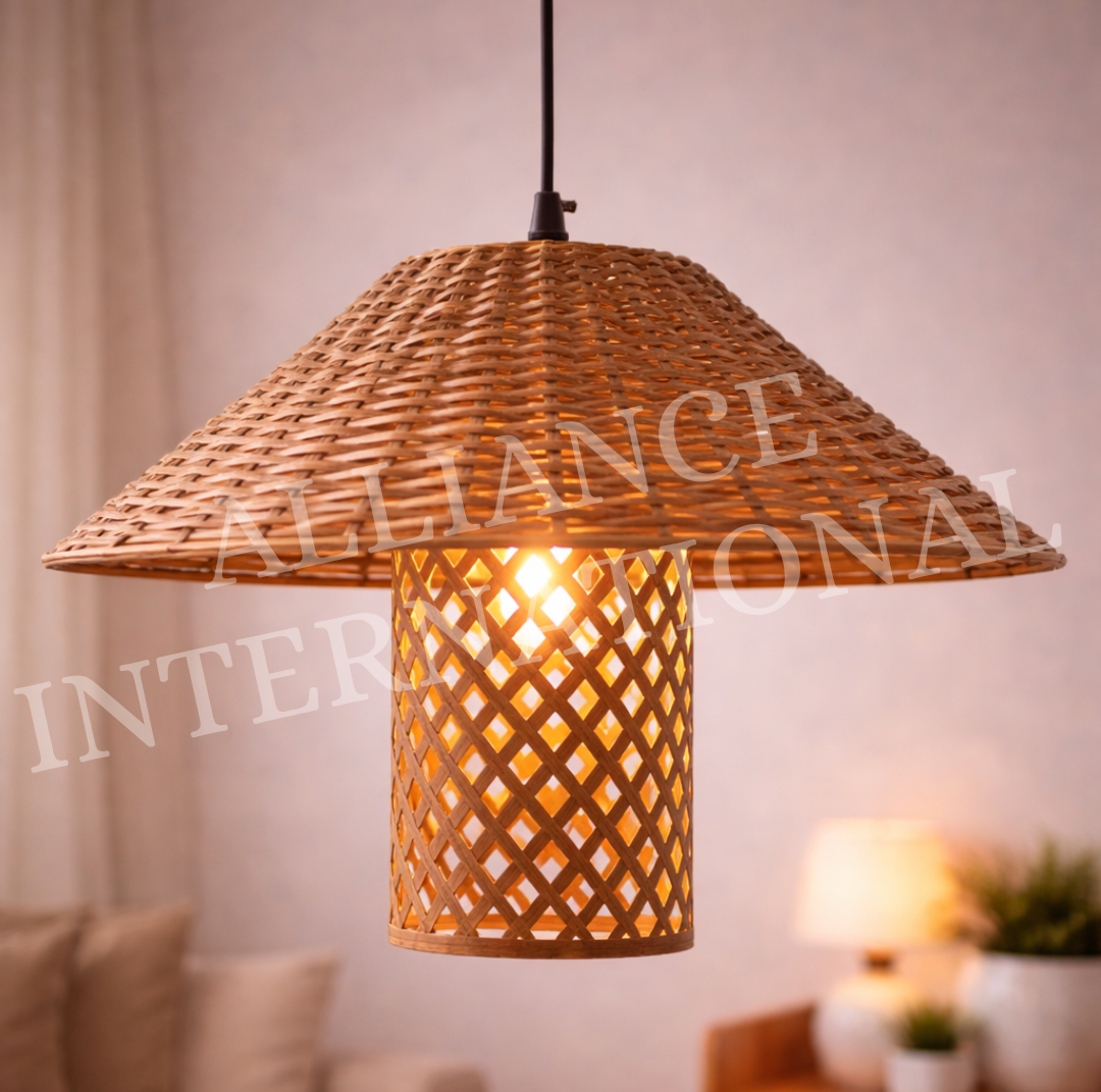 Enhance your interior with this beautifully handcrafted rattan and wooden hanging pendant light, designed with a wide cone dome woven shade and an inner decorative lattice cylinder. This unique dual-layer design creates a rich warm glow while producing stunning shadow patterns that add depth and character to any space.
