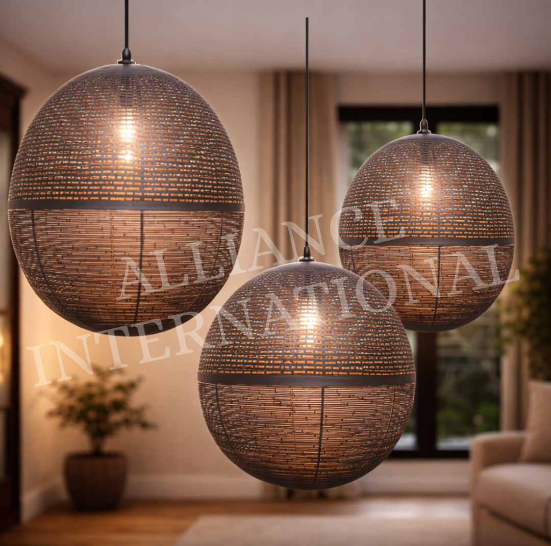 Bring natural elegance and warm ambient lighting into your space with this handcrafted round woven bamboo and metal pendant light. Designed with a beautiful spherical structure, this hanging lamp combines traditional bamboo weaving craftsmanship with a strong metal frame, creating a perfect balance of durability and style.