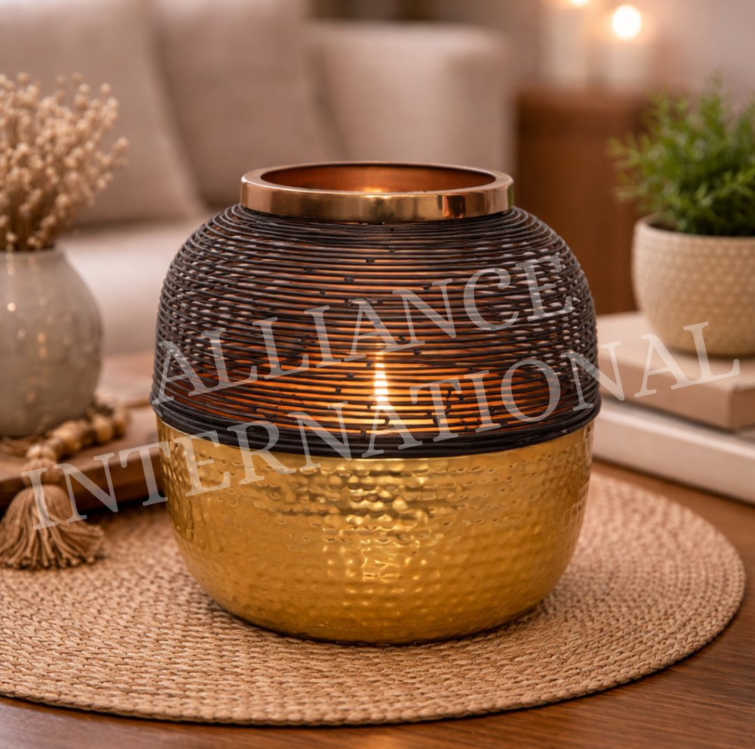 The lower half features a premium hammered gold-finish metal base that adds richness and elegance, while the upper section showcases a textured black wire dome design that allows candlelight to pass through softly, creating a warm glowing ambience. The inner copper-toned finish enhances light reflection, producing a cozy and soothing lighting effect ideal for relaxation and mood décor.