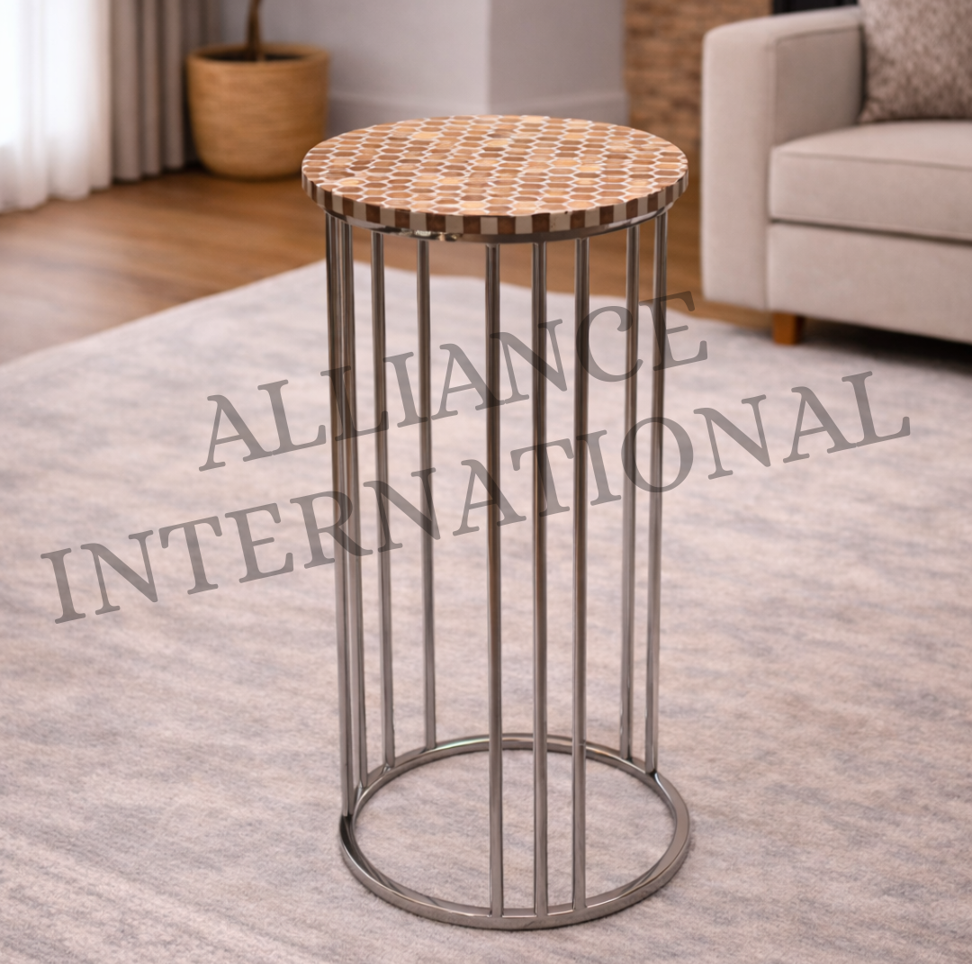 Add a refined touch of modern elegance to your interior with this luxury round mosaic top side table, designed to combine artistic craftsmanship with strong contemporary structure. Featuring a beautiful honeycomb-inspired mosaic tabletop and a sleek stainless steel vertical rod base, this table is ideal for premium residential and commercial spaces.