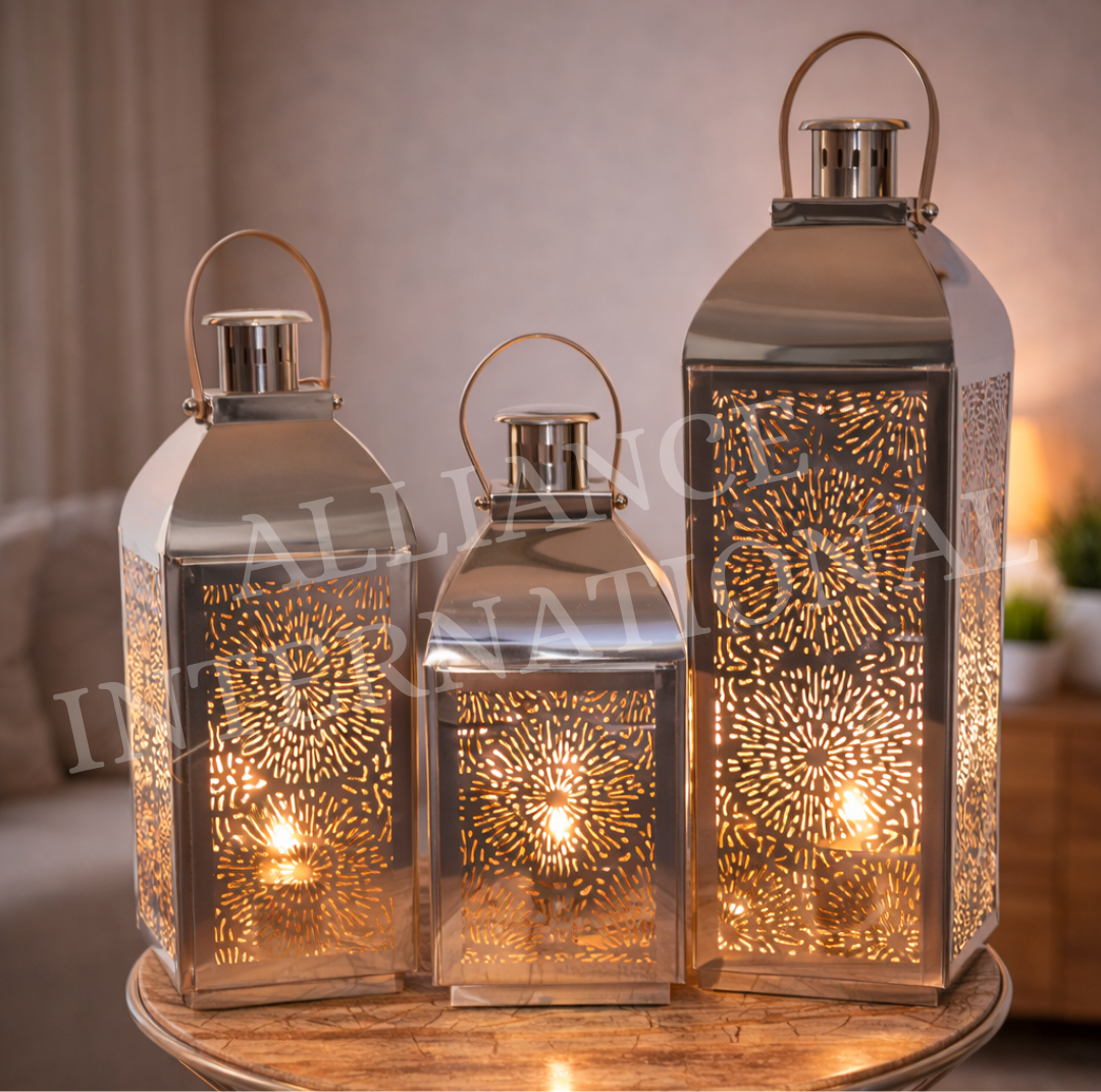 This coordinated trio includes three different sizes, making it perfect for layered styling on tables, consoles, patios, balconies, or event setups. The sleek metallic finish paired with the classic lantern silhouette offers a sophisticated blend of traditional charm and contemporary design. Each lantern is equipped with a sturdy top handle, allowing for easy carrying or hanging to create a captivating lighting display.